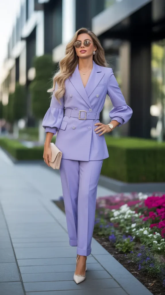 A belted lilac suit combines tailored strength with gentle color. Relaxed sleeves and tapered trousers soften the structure, making it both professional and approachable.