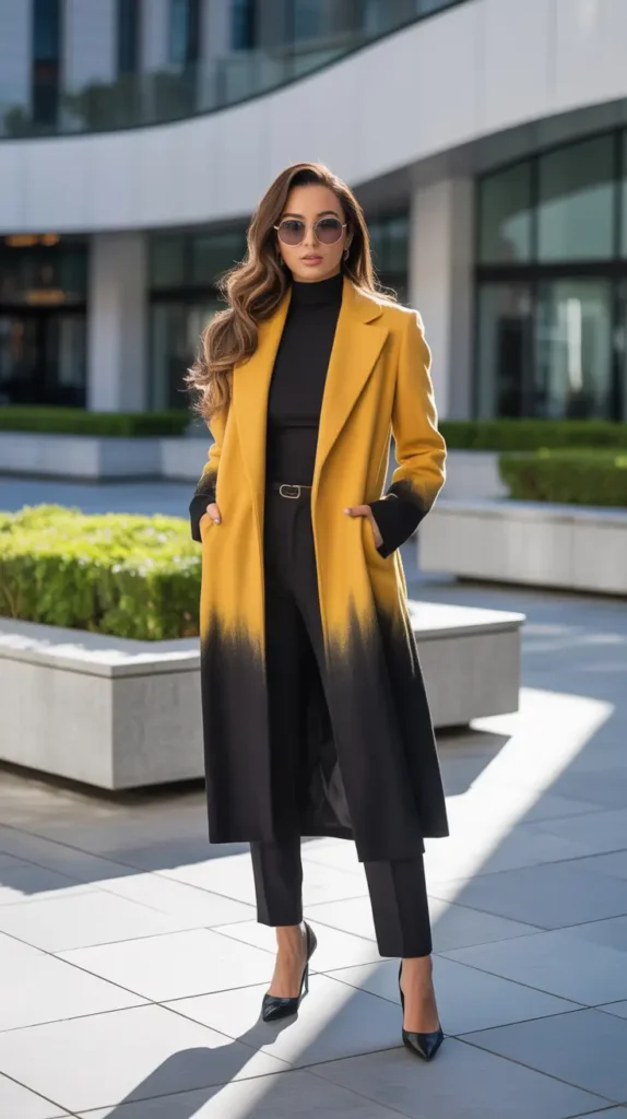 A gradient coat transitioning from warm ochre to deep black transforms a simple base into a powerful look. Clean lines and strong shoulders make outerwear the star.