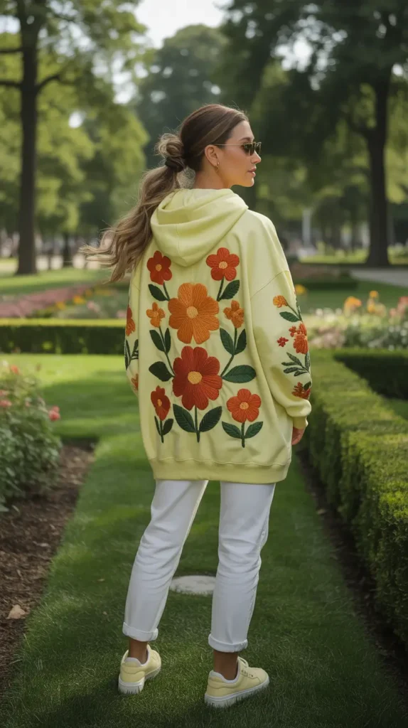 There’s instant joy in a hoodie covered in vibrant embroidery, and this floral-forward style delivers exactly that. Warm reds and oranges bloom against a soft yellow base, creating a look that feels like early spring optimism. Paired with high-waisted white jeans and clean sneakers, the outfit feels fresh, confident, and full of possibility.