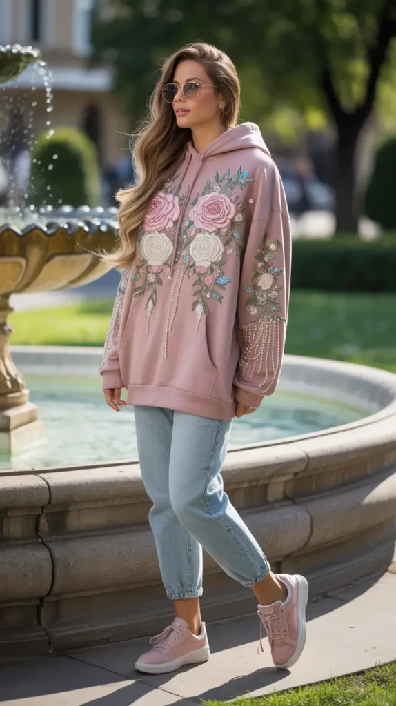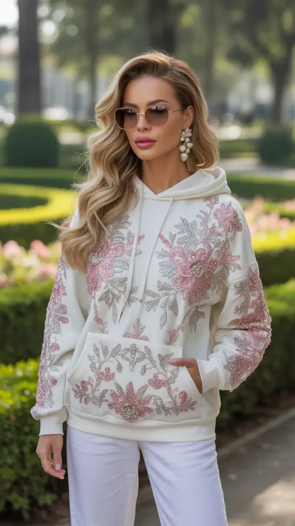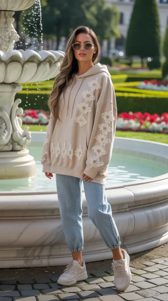 Neutral hoodies with raised florals, appliqué, or crochet trim bring quiet luxury to everyday wear. Oversized silhouettes paired with white denim or light joggers create outfits that feel calm, polished, and effortlessly chic.
