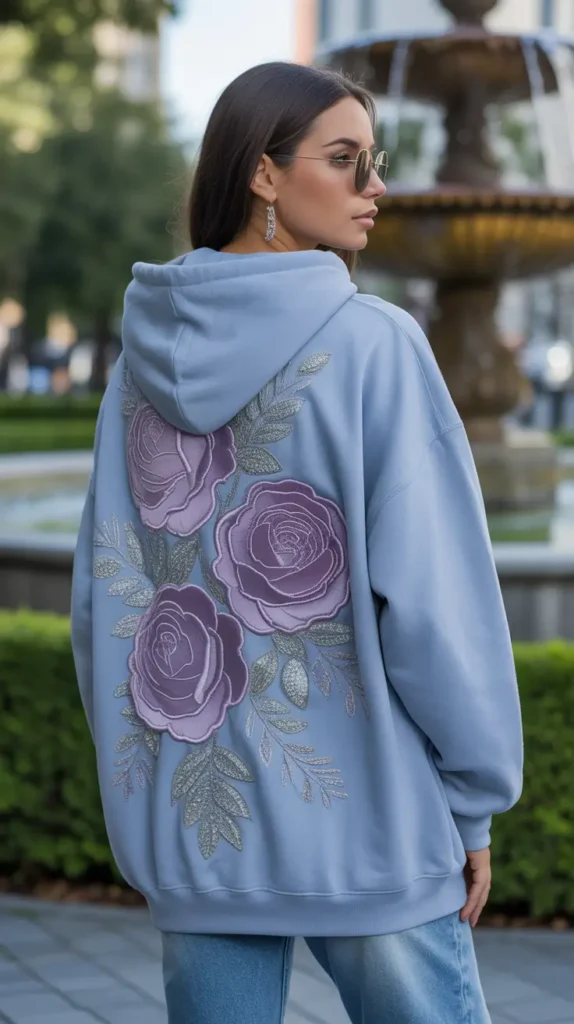 Lavender continues its quiet rise this year, and embroidered details make it feel even more special. Soft rose motifs placed along the shoulders and back give this hoodie a couture-inspired feel while remaining entirely wearable.