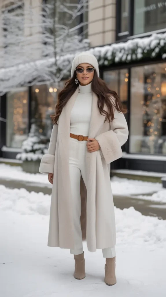 Plush beige faux-fur coats paired with cream combat boots ground luxury in everyday wearability. Small designer handbags and tonal layering elevate the look without making it feel staged. These outfits move seamlessly from daylight coffee runs to evening winter strolls, proving neutrals never have to be boring.