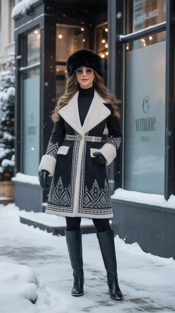 Faux fur in caramel and white dominates alpine-inspired fashion. Oversized boots, sleek leggings, and bold textures deliver après-ski fantasy straight into city life. Designers embrace vacation winterwear for everyday glamour—warm, confident, and richly layered.
