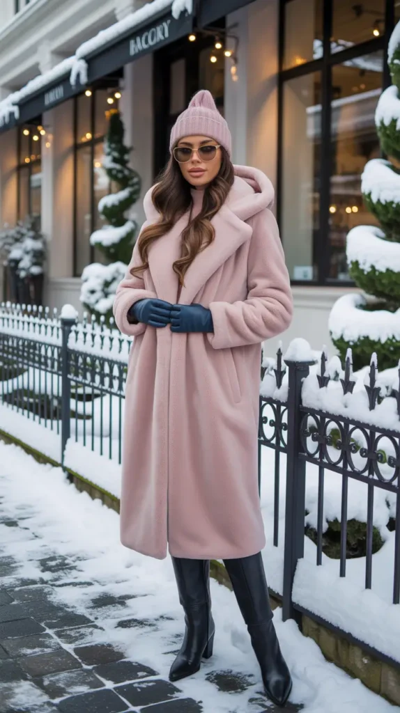 Powder-pink coats deliver romance without fragility. Structured lapels, ribbed hats, and black accessories maintain strength beneath softness. Pastels become winter’s answer to gray—warm, confident, and uplifting.
