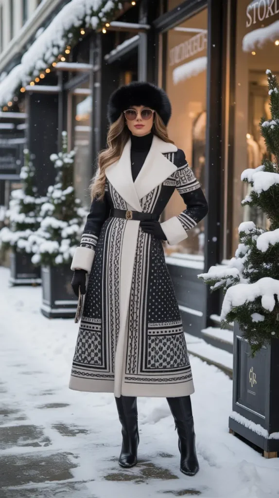Geometric black-and-white patterned coats celebrate old-world craftsmanship through futuristic tailoring. Broad lapels, cinched waists, and statement belts prove that pattern can feel both luxurious and contemporary.