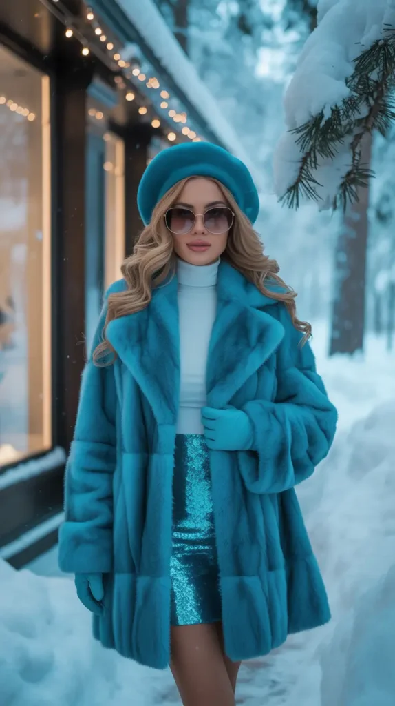 Color blocking takes on an icy intensity this season. Saturated turquoise jackets paired with matching berets and gloves feel cinematic and fearless. Glossy mini skirts add just enough edge, while oversized outerwear keeps it grounded. This look thrives on contrast—party-ready shine meets winter practicality. Blue becomes winter’s most energizing color, lifting dark days with unapologetic vibrance.