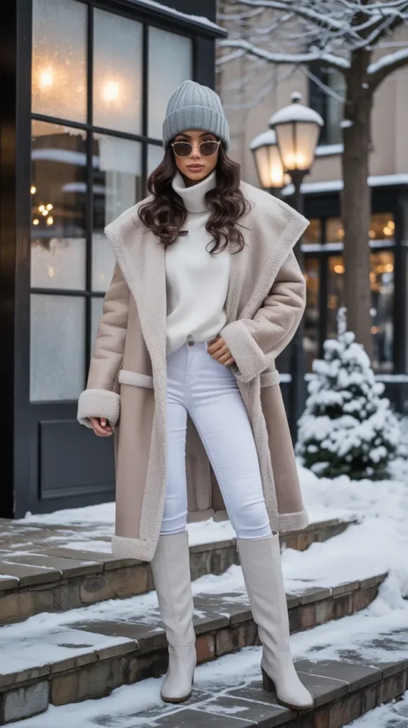 Winter layering doesn’t have to be bulky to be warm. Shelly-lined coats over slim white jeans and turtlenecks strike a balance between comfort and polish. Beige-on-white palettes remain effortless, while tall boots elongate the silhouette. Texture becomes the secret weapon—tonal knits, smooth leather, and soft wool add depth without disrupting simplicity.