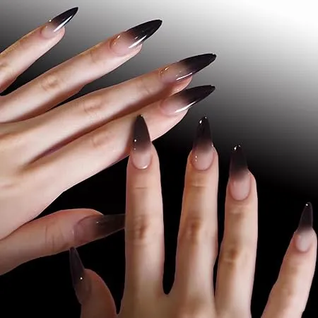 Sleek stiletto nails that fade from nude to jet-black tipsâwitchy, elegant, and perfect for October.