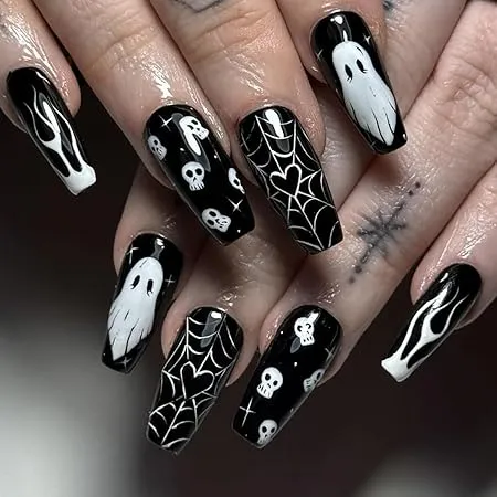 Glossy black nails with hand-painted ghosts, webs, and skulls.