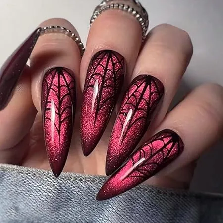 Magenta shimmer topped with glossy black webs for spooky glam.