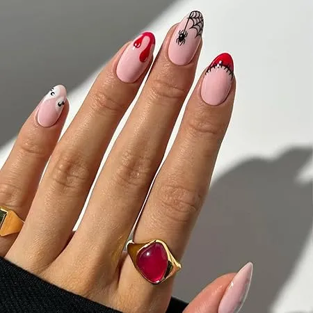 Soft pink base with red drips, spiderwebs, and ghostly accents.
