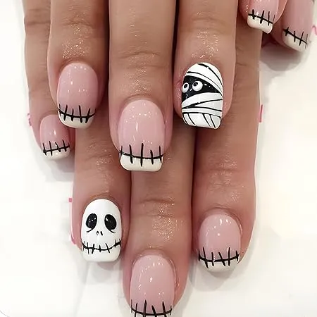 Pink nails with stitched tips and mummy accentsâcute and spooky combo.