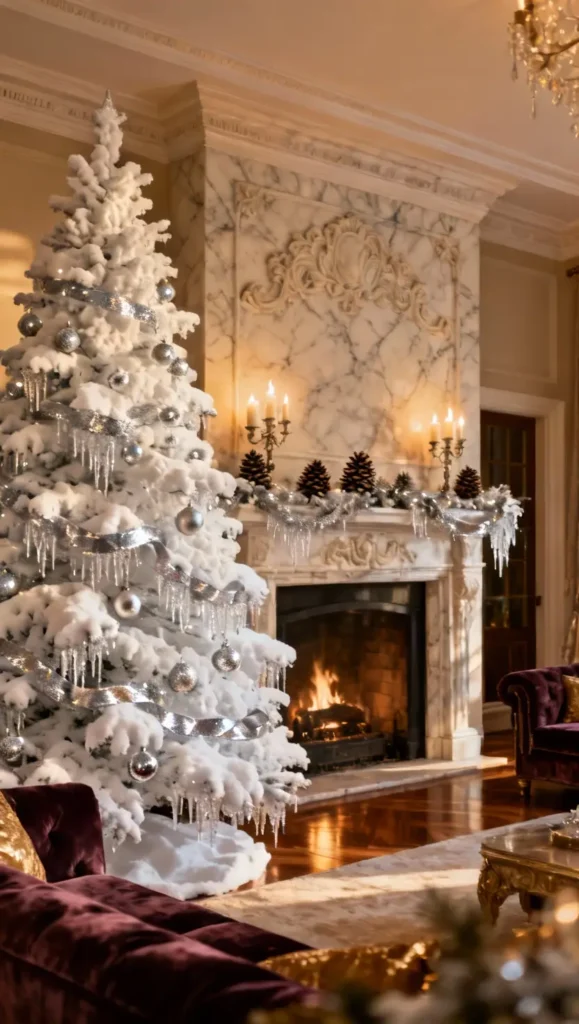 Bring a winter wonderland indoors with flocked trees. Thick artificial snow with silver or pale blue accents instantly adds majesty and texture, even in snowless areas.