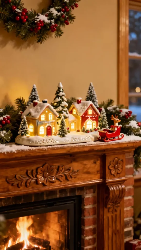 Create a miniature, lit-up holiday town on a mantel or dedicated table. Watching the tiny lights glow is heartwarming and fun for all ages.