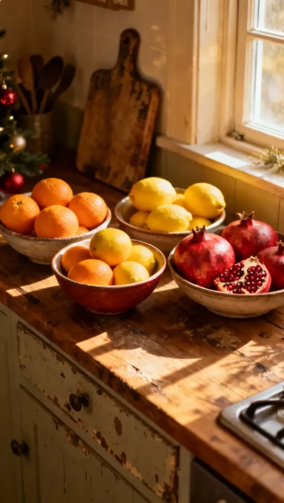 Skip fragile, pricey ornaments and let nature shine. Fresh citrus, deep red pomegranates, or even apples work beautifully on counters or garlands. Rustic, fragrant, and charming—just swap out any fruit before it spoils.