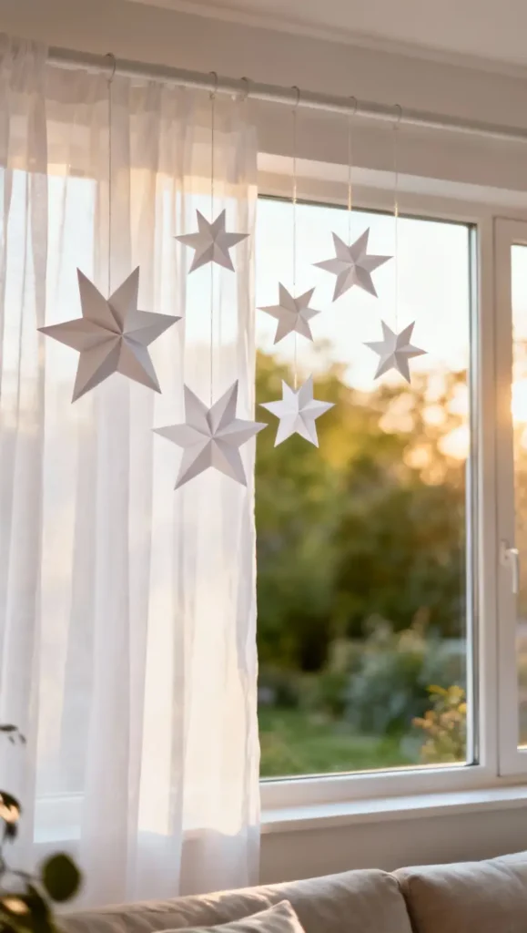 Minimalists rejoice: folded white paper stars for windows create soft, ambient light and a Scandinavian-inspired, clean aesthetic. Elegant, easy, and sophisticated.
