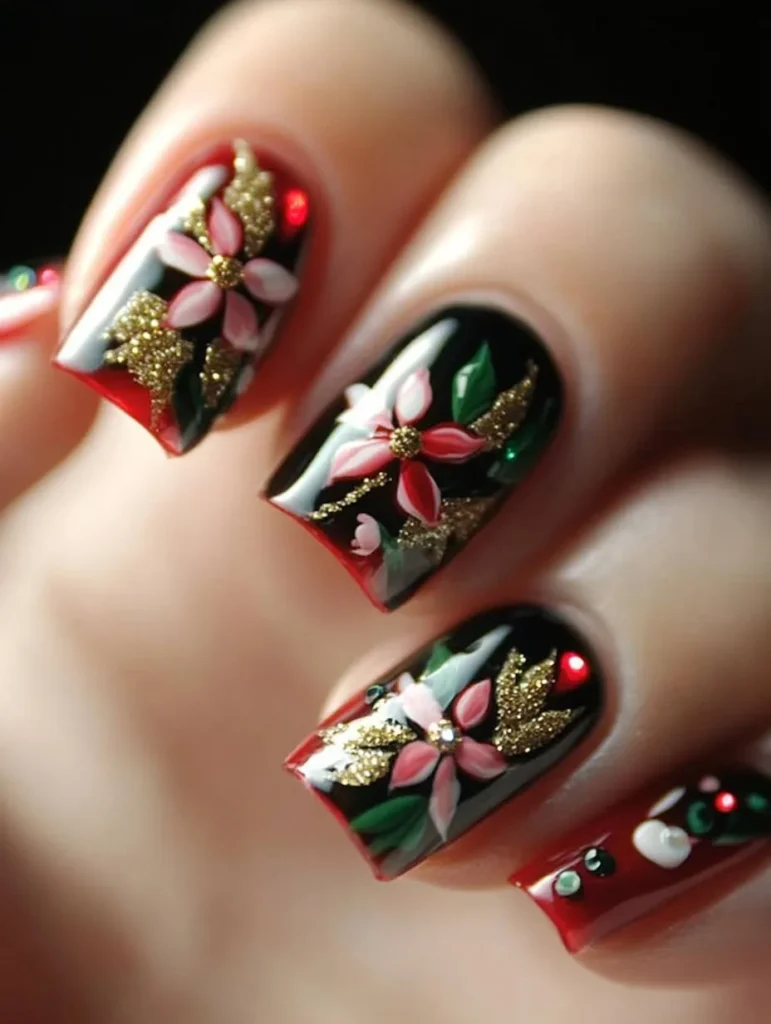 A chic twist on holiday nails, this design combines deep red and black bases with hand-painted floral accents in pink and green. Sparkling gold details tie it all together, creating an artful manicure that’s both playful and refined. Perfect for parties, this look can be achieved with nail stickers or freehand painting for a personal touch.