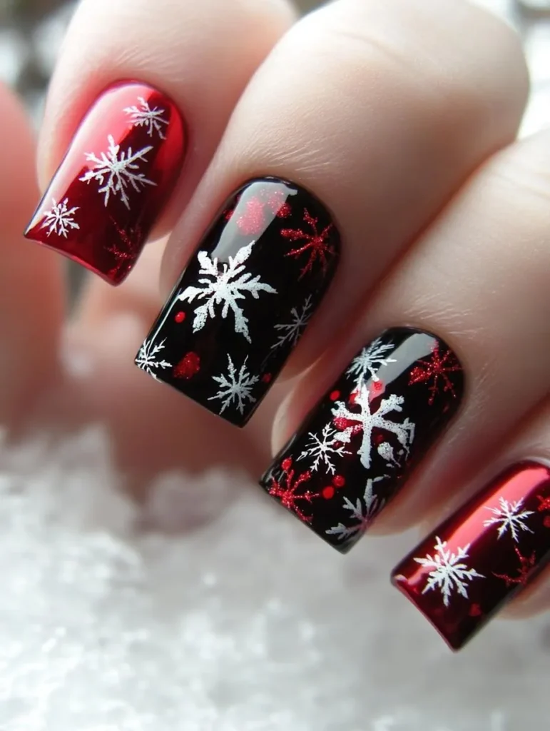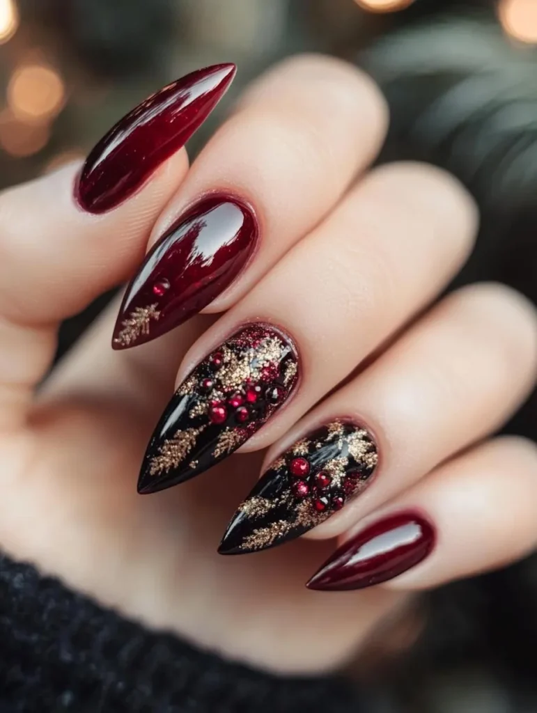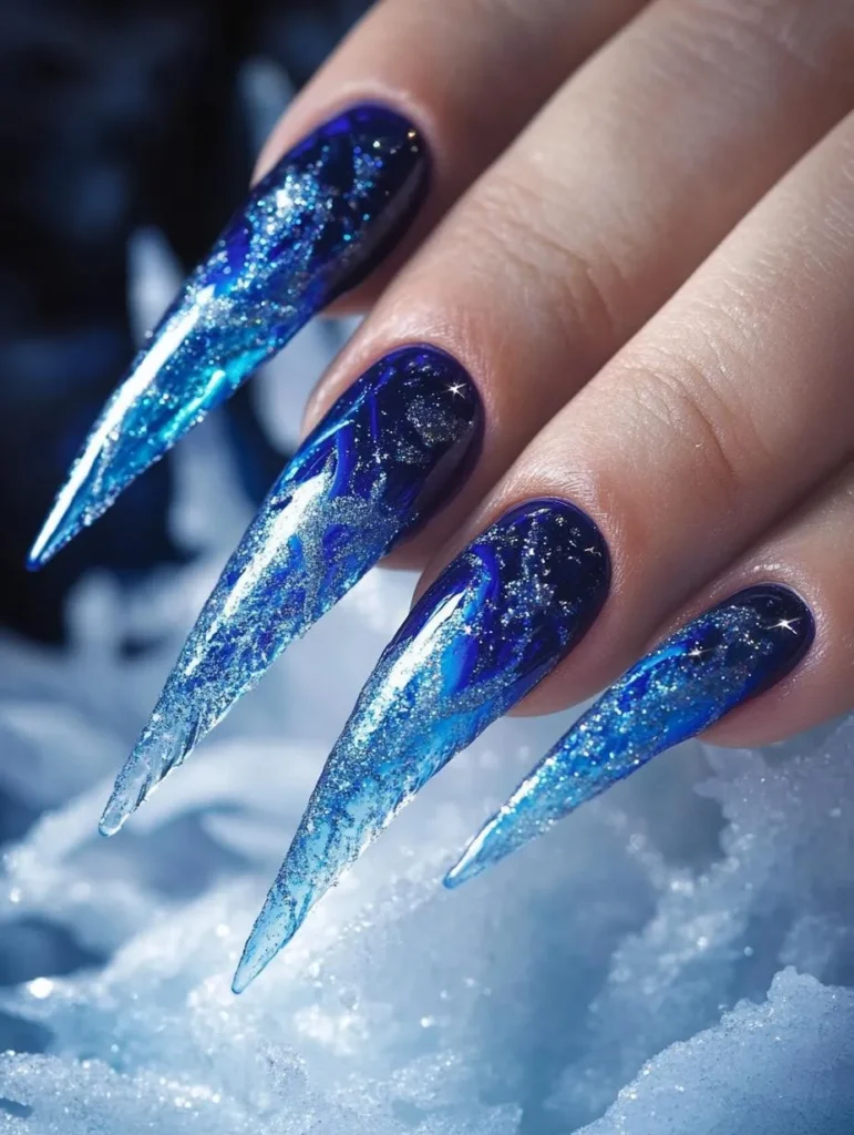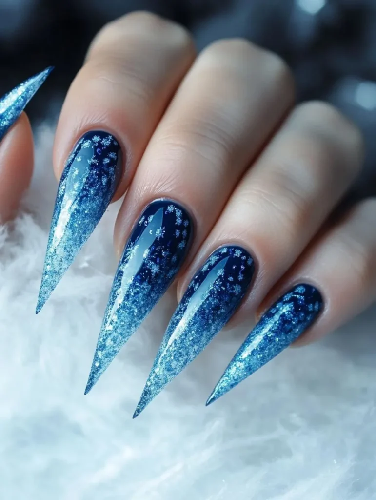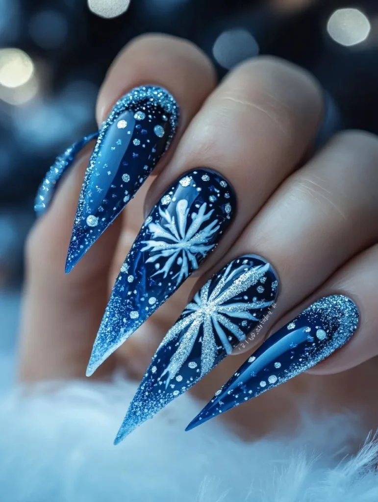 Deep navy and icy silver nails are perfect for evoking frosty nights and twinkling snow. Add delicate snowflakes or glitter gradients for a look that’s equal parts whimsical and elegant. Long stiletto or almond shapes enhance the drama, while a glossy gel finish ensures lasting shine.