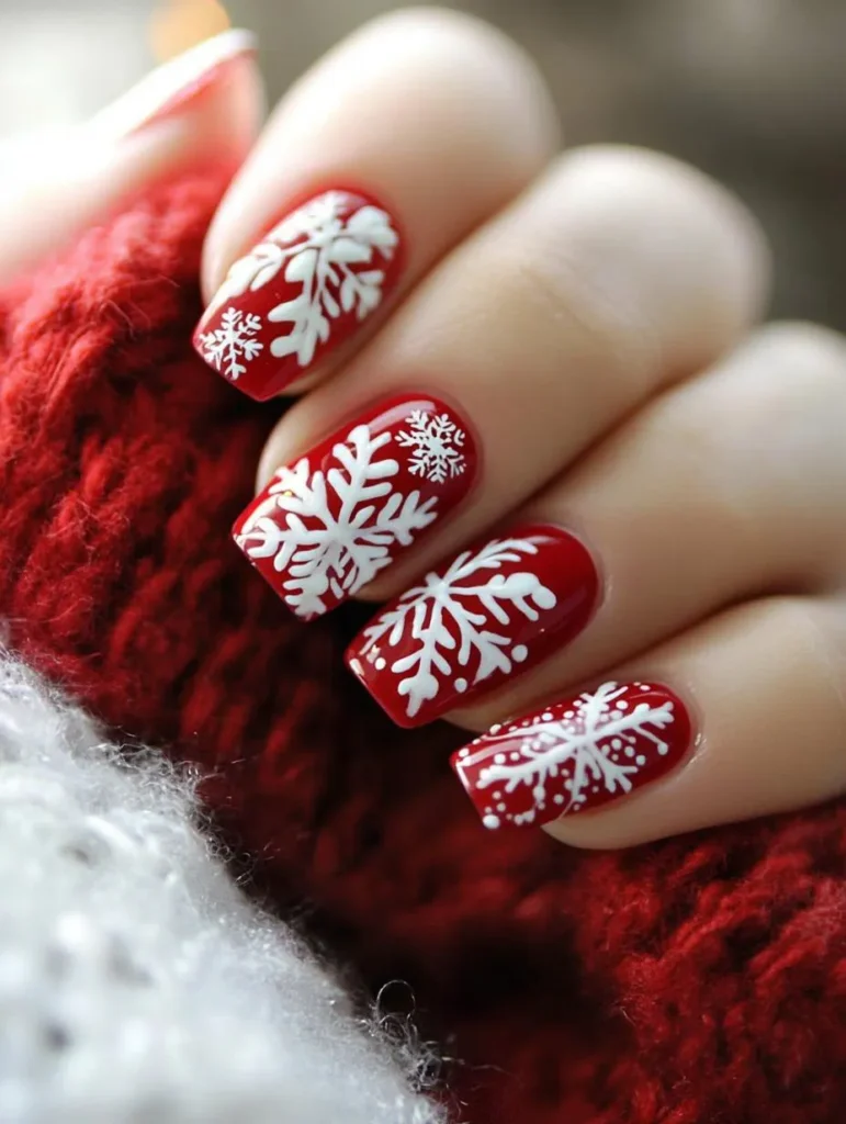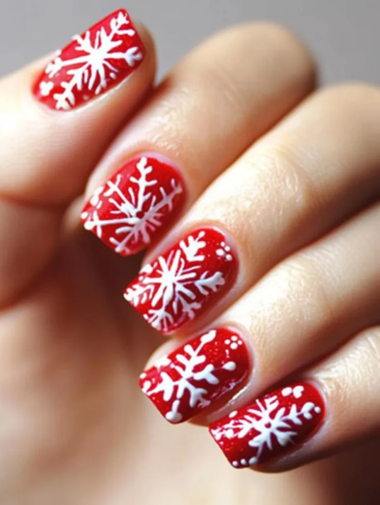 A timeless holiday look, this design features a vibrant red base decorated with delicate white snowflakes. It strikes the perfect balance between playful and elegant, suitable for everything from office parties to Christmas Eve dinners.