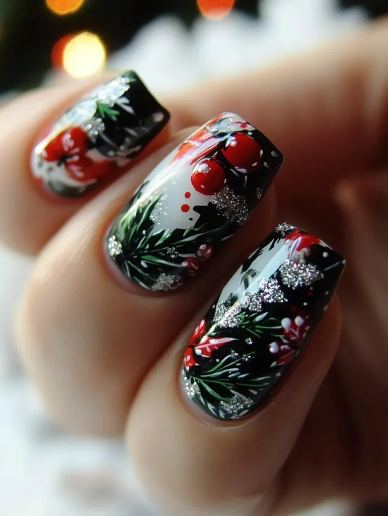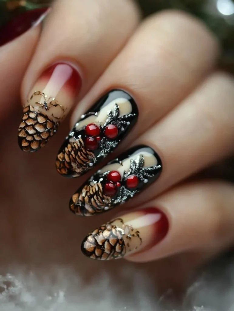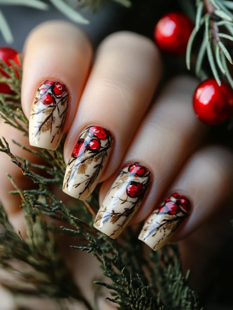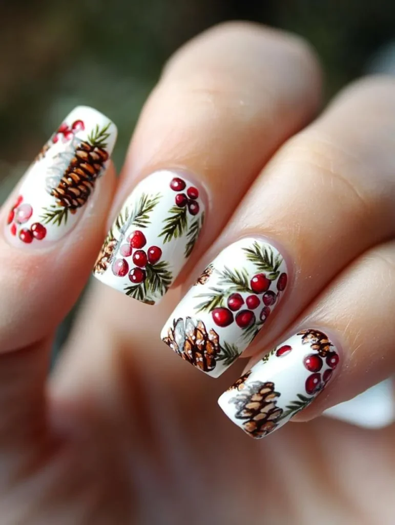 For something unique, pinecone and holly berry designs painted over soft neutrals or snowy whites bring an earthy, artistic vibe. A matte finish highlights the intricate details, while glossy top coats enhance shimmer and depth.