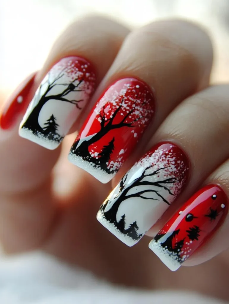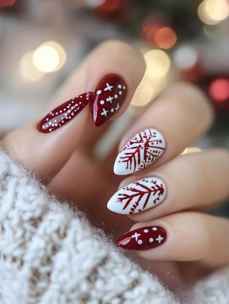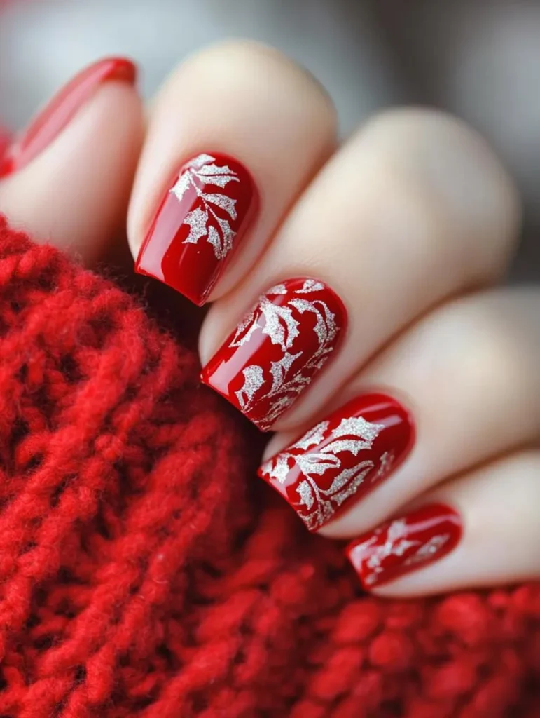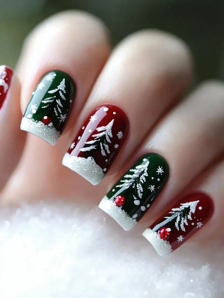 For something unique, pinecone and holly berry designs painted over soft neutrals or snowy whites bring an earthy, artistic vibe. A matte finish highlights the intricate details, while glossy top coats enhance shimmer and depth.