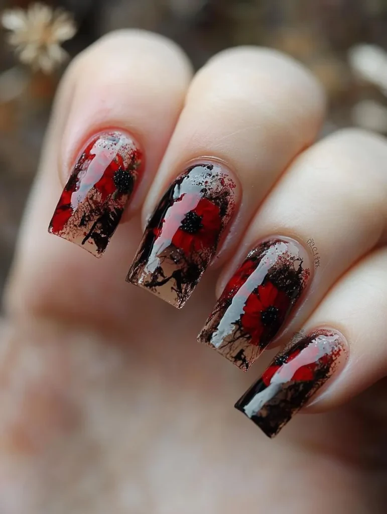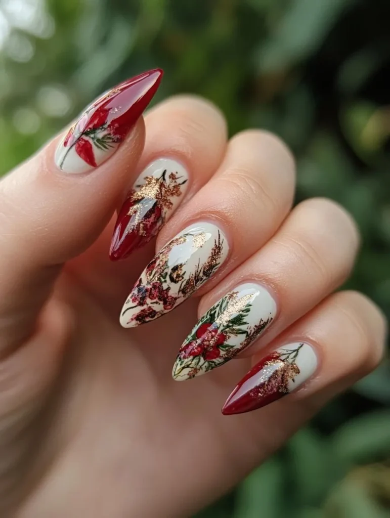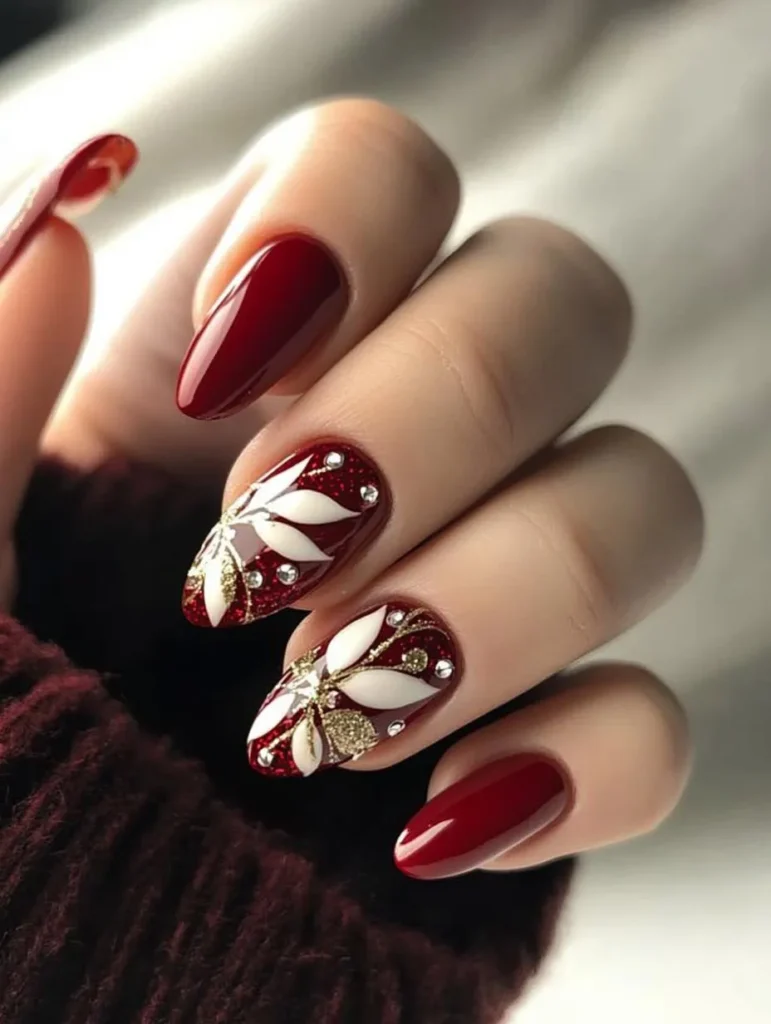 Celebrate the season with floral accents inspired by Christmas poinsettias. Deep reds paired with leafy greens or earthy tones bring warmth and charm. A matte base topped with glossy floral details creates depth and sophistication.