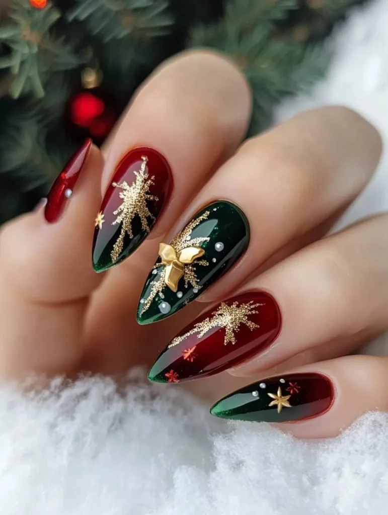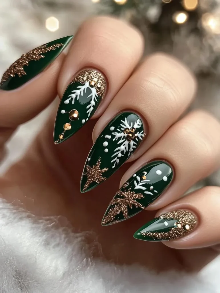 For a design that feels festive yet sophisticated, choose a rich evergreen base with golden snowflakes, foil accents, or glitter tips. This bold combo pairs beautifully with cozy knits or a sparkly holiday dress.