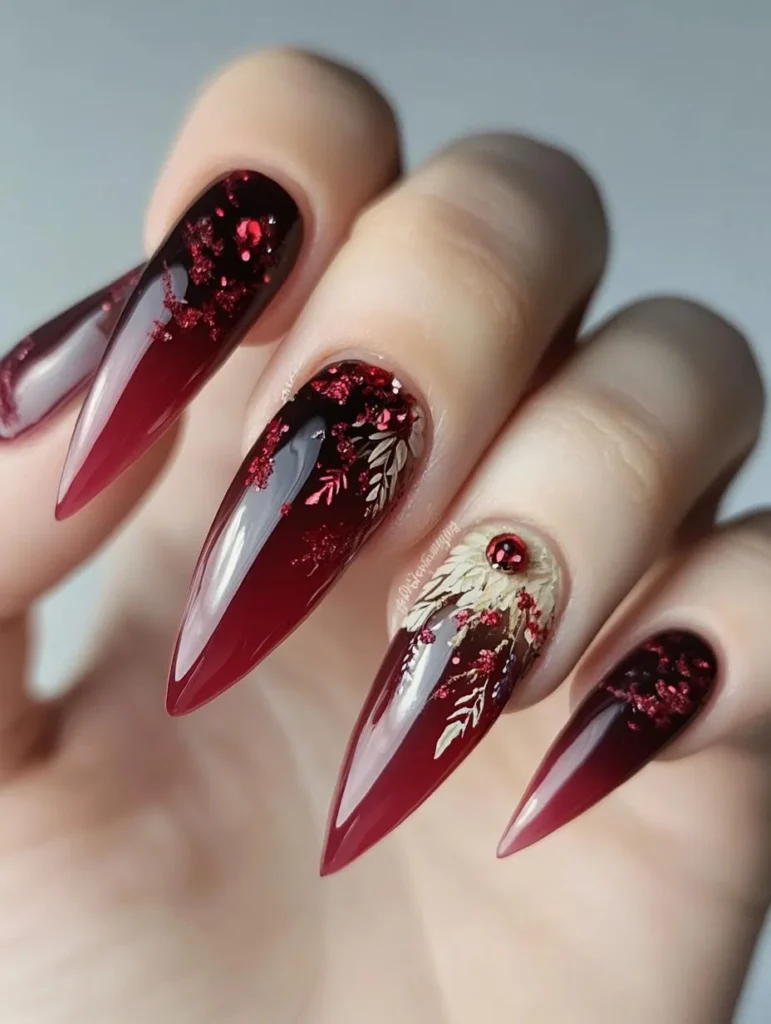 Nothing says Christmas quite like crimson paired with shimmering gold. A glossy red base adorned with gold foils, glitter, or delicate floral accents exudes glamour. Pair with a red lip or sparkling accessories for a coordinated holiday-ready style.