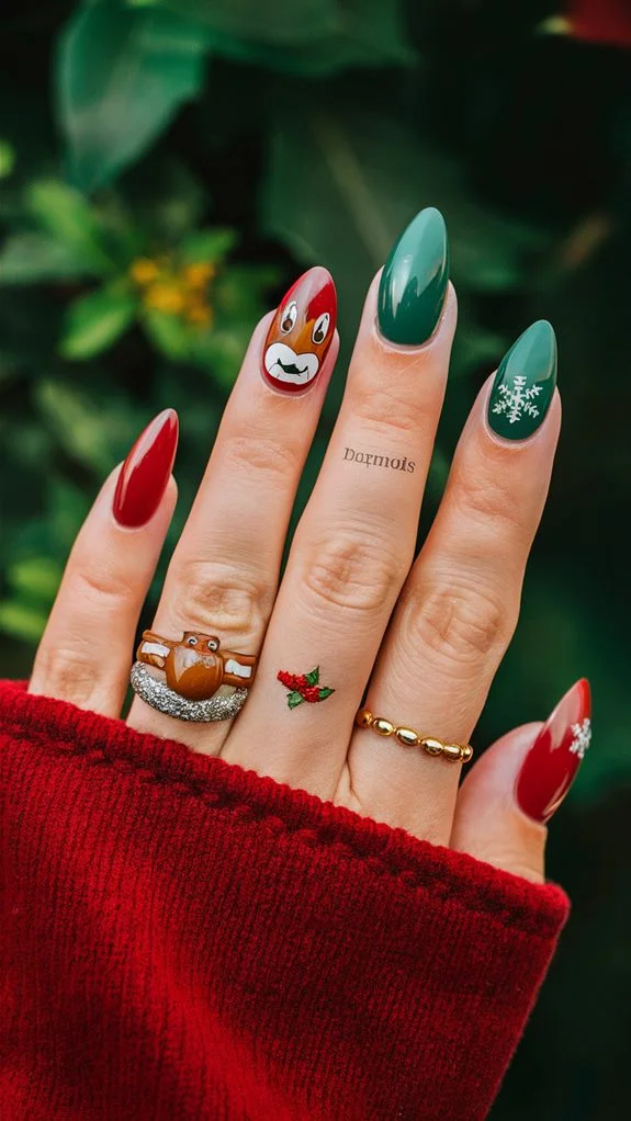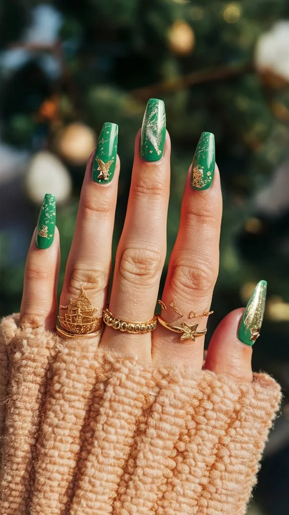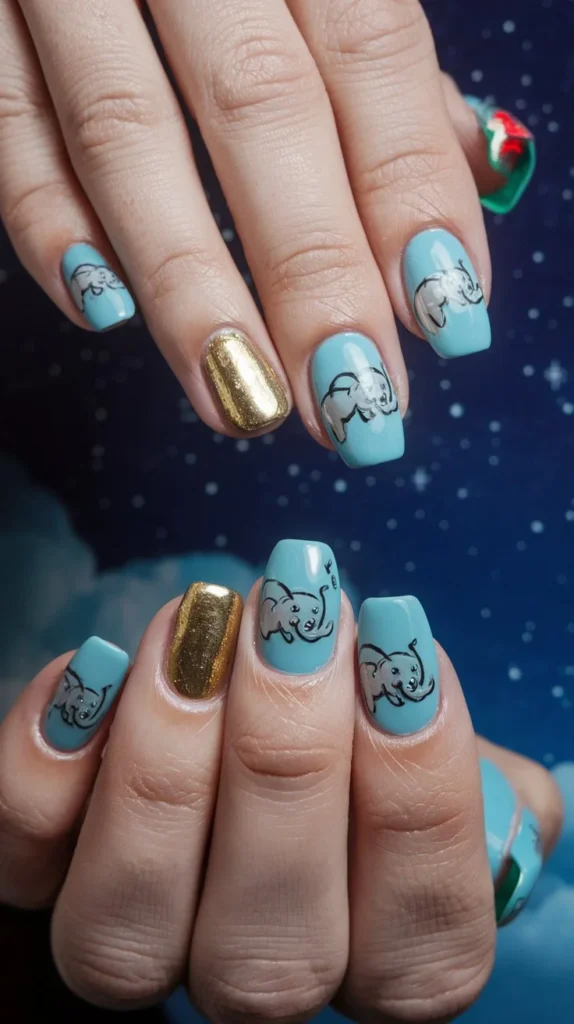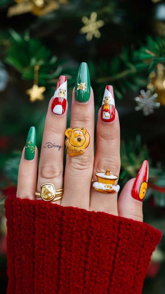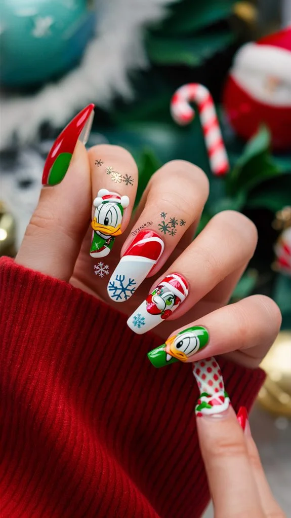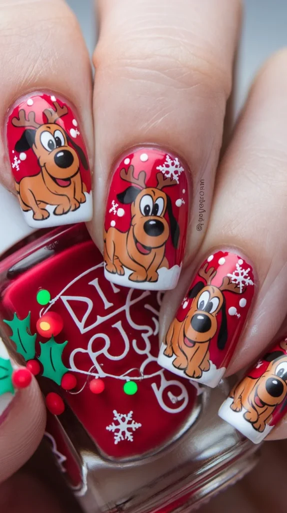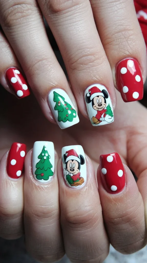 Celebrate classic Disney magic with Mickey-inspired nails. Start with a bold red base and add tiny white polka dots for his signature style. Green holly accents or sparkling Christmas tree designs give this manicure a cheerful holiday finish. Don’t forget Mickey’s iconic ears for an extra dose of charm.