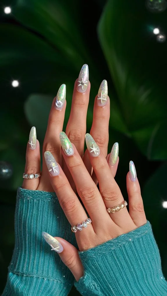 Dive into an ocean-blue base with glittering seashells, starfish, and tiny holly berries for a Christmas-meets-mermaid look.