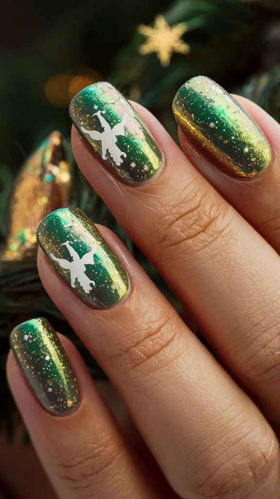 Create a magical glow with pastel green nails dusted in gold glitter. Add swirling gold lines or star decals to mimic Tinker Bell’s sparkling trail.