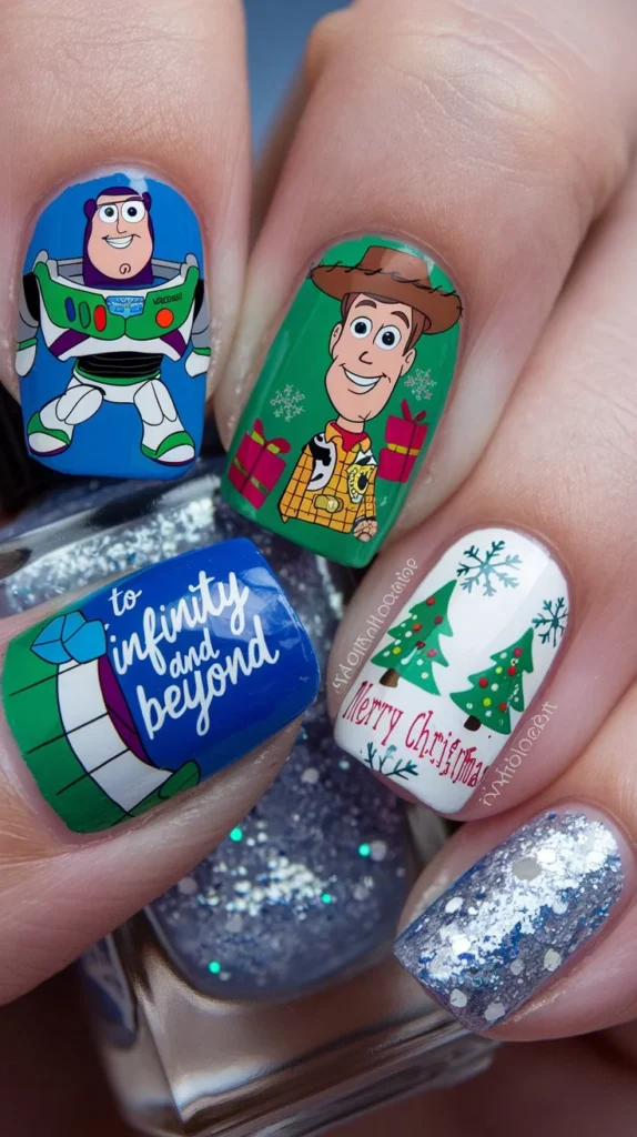 Mix classic Christmas colors with Toy Story details—Buzz’s green and purple, Woody’s cow-print vest, or tiny sheriff badges—plus a hint of glitter for intergalactic holiday cheer.