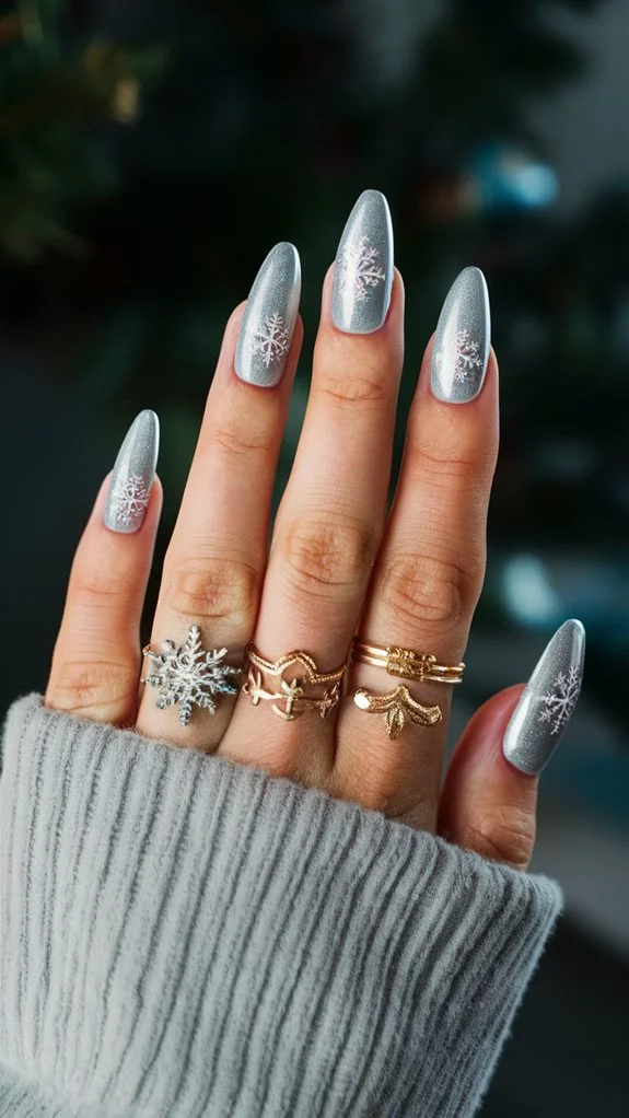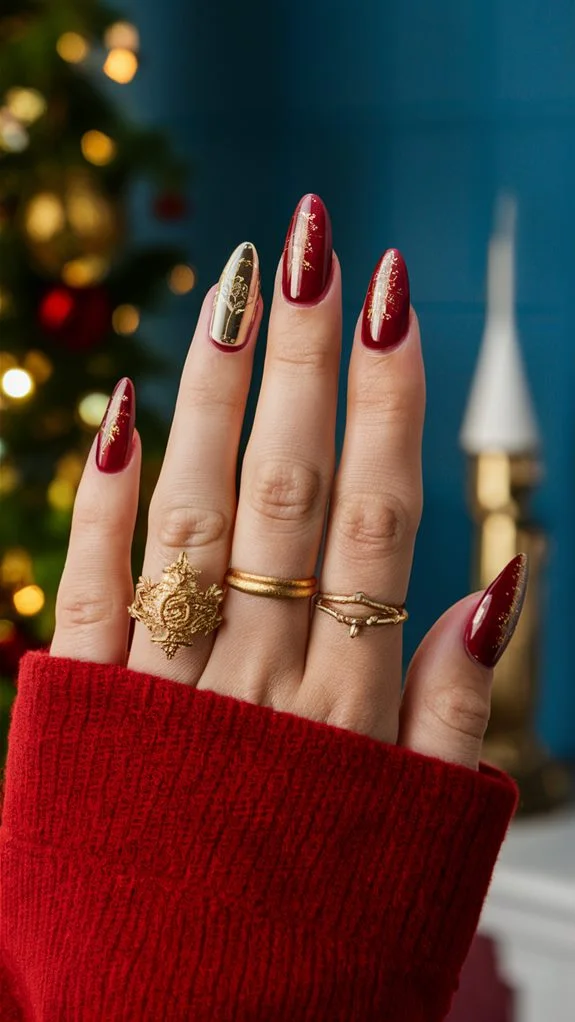 Channel a fairy-tale Christmas with an icy blue base and silver glitter tips that mimic falling snow. Accent nails can feature tiny rhinestones, glass slippers, or pumpkin carriage decals for extra magic.