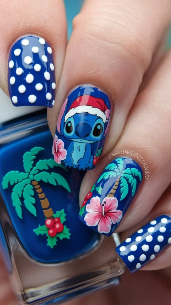 Combine bright ocean blues with tropical palm trees and hibiscus flowers. Add Stitch’s adorable face and a tiny Santa hat for a festive island twist.