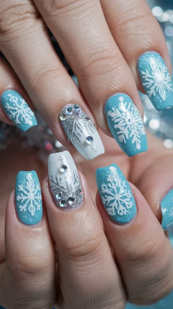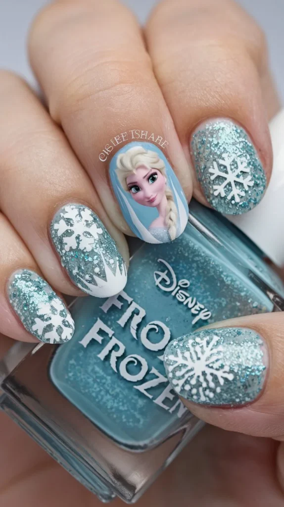 Start with an icy blue base, then paint delicate white and silver snowflakes. A hint of glitter or rhinestones adds icy brilliance to this Frozen-inspired look.