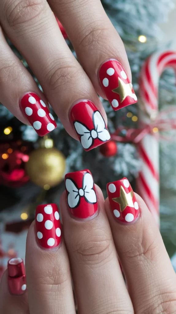 Add a touch of elegance with Minnie’s famous bow. Paint your nails red, then use white or gold to create her cute, triangular bow design. A tiny dot in the center ties the look together—perfect for a sophisticated yet playful Christmas vibe.