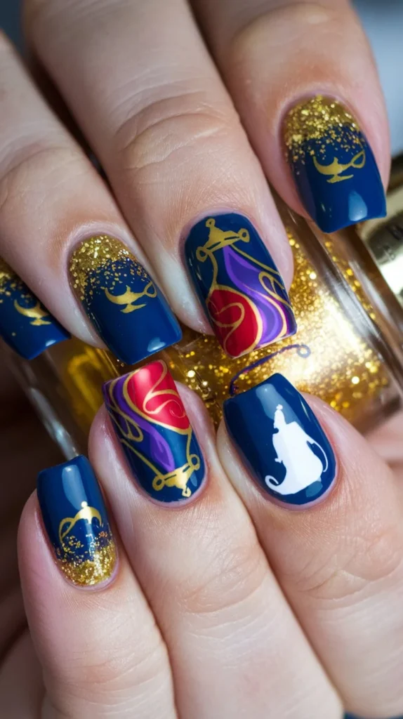 Layer royal blue polish with gold foil accents, magic carpet details, and tiny Genie lamps for a manicure as dazzling as Agrabah’s night sky.