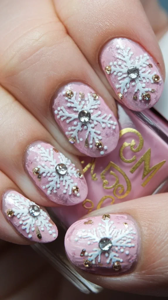 Soft pink nails with shimmering snowflakes and golden accents create a dreamy, elegant winter look inspired by Aurora’s timeless story.