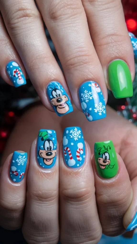 Goofy’s quirky charm comes alive with bright blue polish, green accents, and playful snowflakes. Add his hat or a silly grin on an accent nail for a whimsical holiday design.