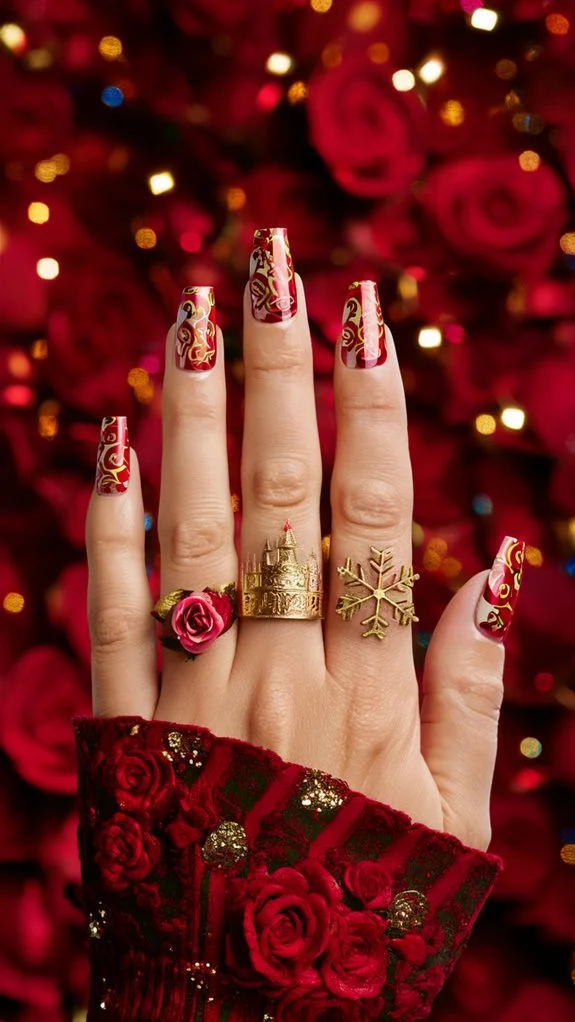 Create a romantic holiday manicure with a golden base inspired by Belle’s gown. Add red roses, glittery gold details, or an enchanted rose decal for a magical Beauty and the Beast theme.