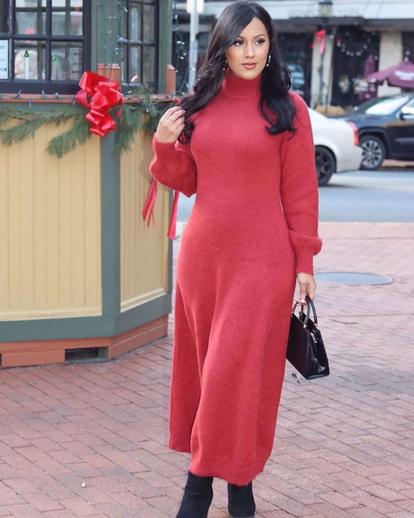 A warm red knit dress embodies the spirit of the holidays—comfortable, flattering, and effortlessly chic. Perfect for family dinners or Christmas market strolls, it’s a timeless winter staple. Pair it with ankle or knee-high boots and a structured bag for instant polish.