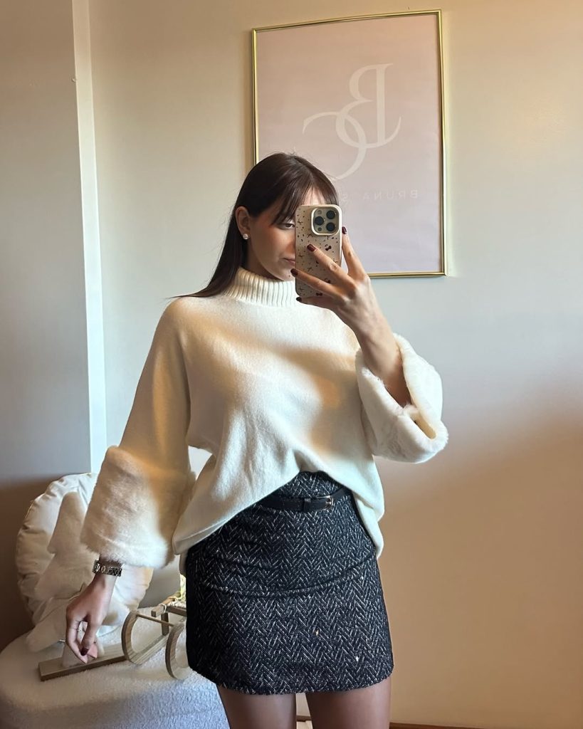 A crisp white sweater paired with a sleek mini skirt creates a look that’s both playful and elegant. Perfect for holiday cocktails or girls’ nights out, this outfit balances comfort and sophistication. Add tights and ankle boots for a classy finish.