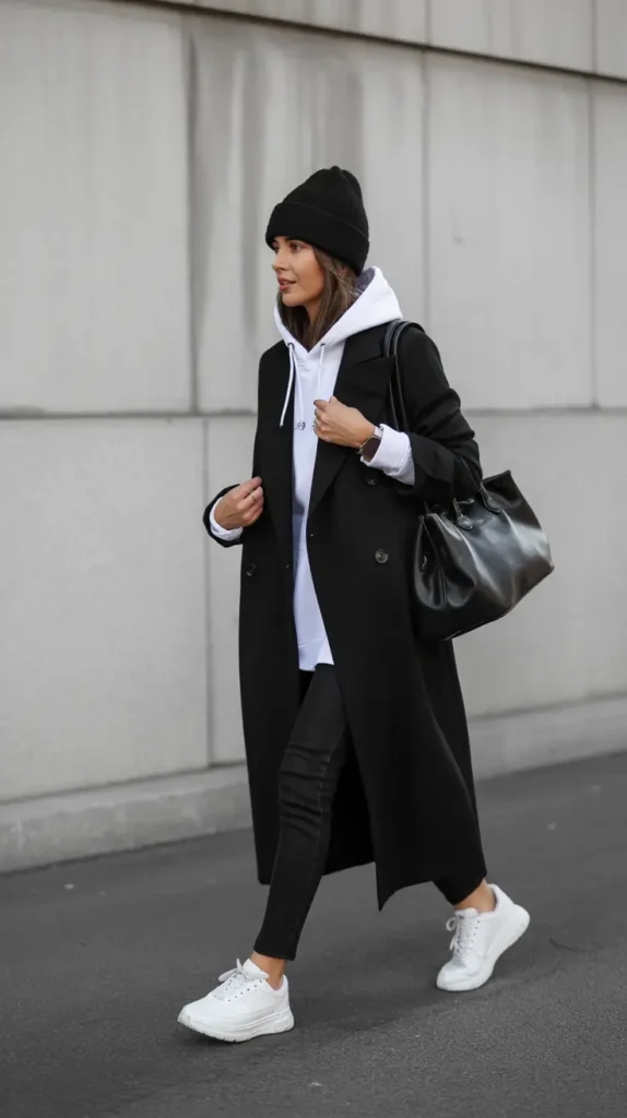 Streetwear refined: a tailored black coat over a crisp white hoodie, slim trousers, and clean trainers. Sleek yet casual.