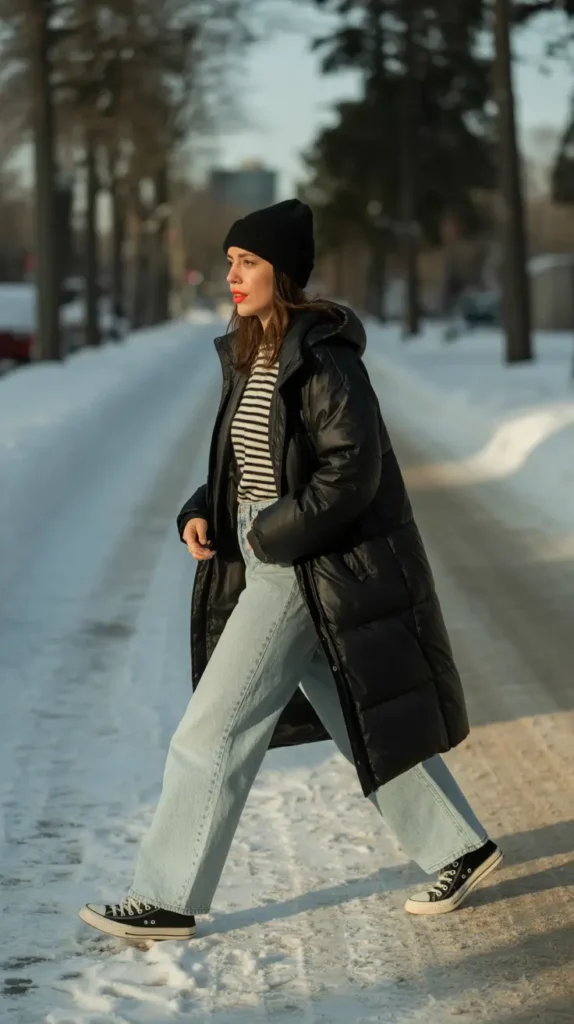 French casual meets NYC street: a striped knit, straight denim, and canvas sneakers under a black longline puffer. Easy, cool, and ideal for city walks.