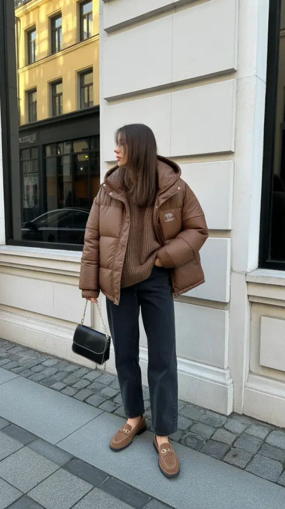 Sophisticated neutrals: brown puffer, slim charcoal jeans, knit sweater, leather loafers, and a short-strap crossbody bag. A smart-casual weekday favorite.