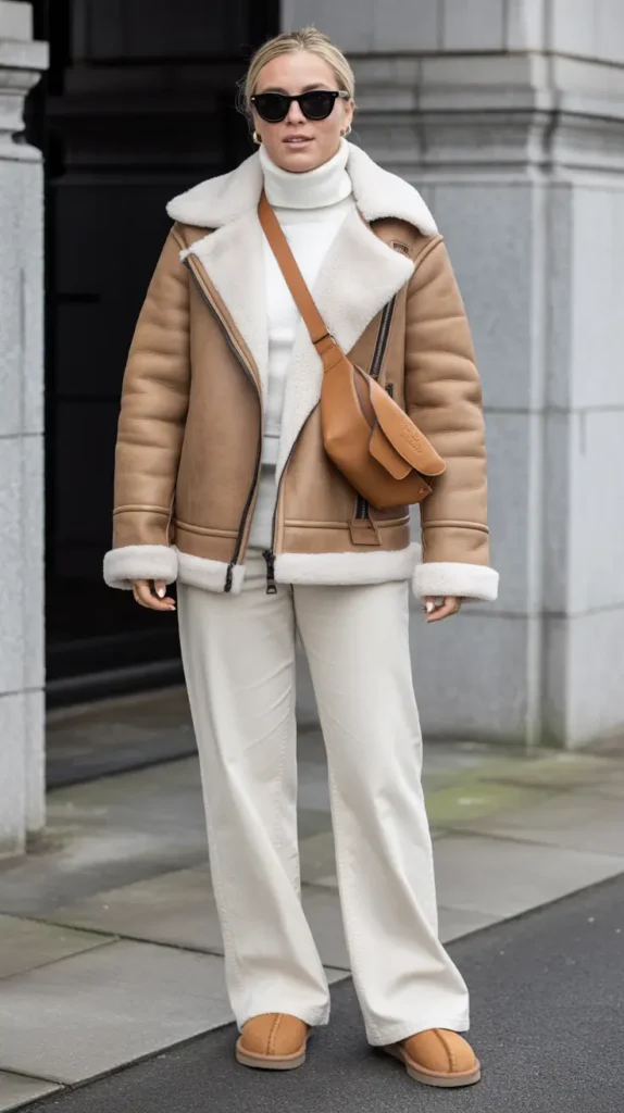 Elevated cozy: shearling aviator over a cream turtleneck, loose white trousers, and slippers or suede boots. Balanced with caramel crossbody and chic sunnies.