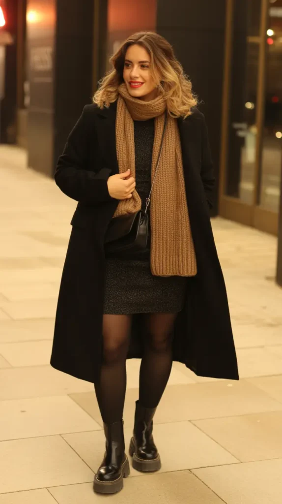 After-dark ease: long black coat layered over a shimmering knit mini, tights, and platform Chelsea boots. Add a cocoa scarf for warmth and definition.