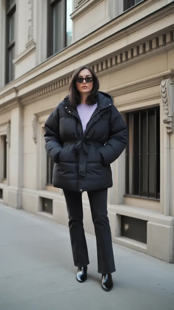 Think city armor: a waist-cinched black puffer, lilac knit for contrast, slim kick-flare trousers, and glossy ankle boots. This look moves seamlessly from the office to after-hours.