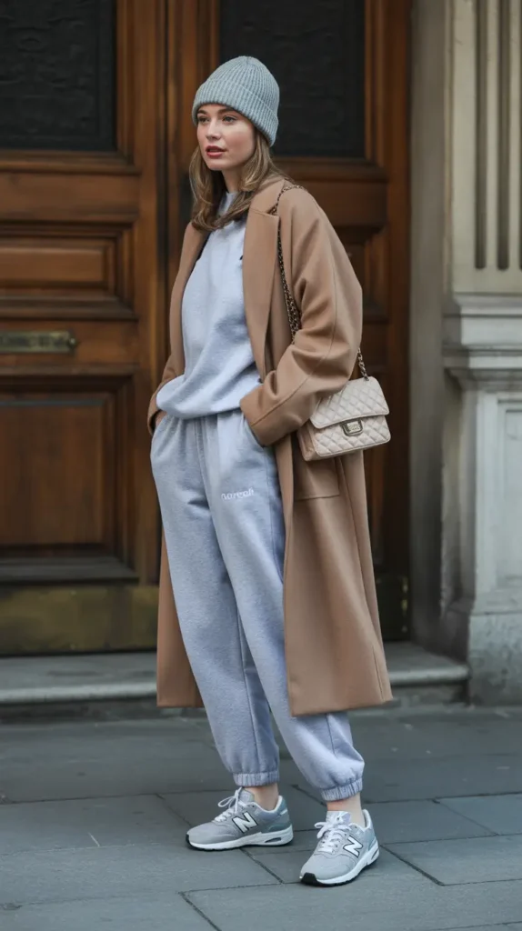 Athleisure meets tailoring: camel maxi coat over a grey hoodie and joggers, paired with heritage sneakers and a quilted bag. A Seoul-meets-NYC weekend essential.