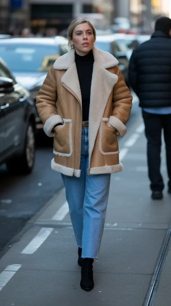 Timeless and effortlessly luxe, a camel shearling pairs perfectly with light-wash denim, a fine-knit black turtleneck, and sleek ankle boots. Add a slim belt for subtle shaping.